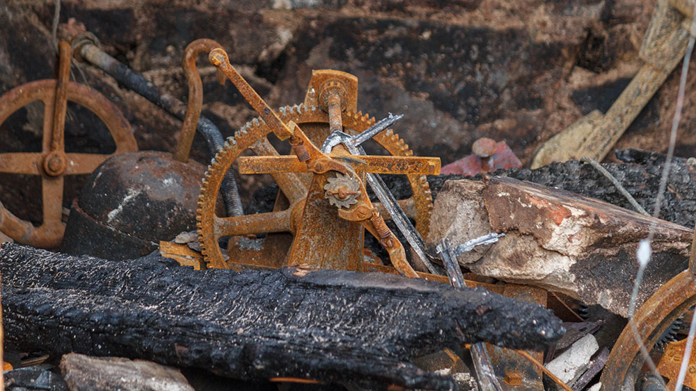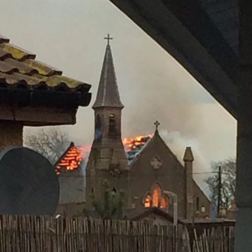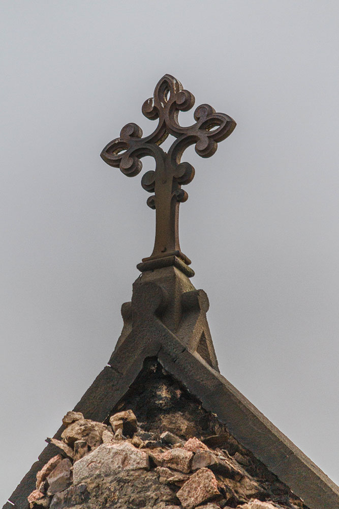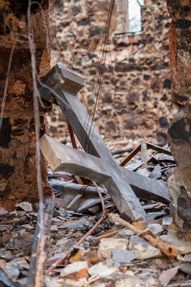 The cross which once stood on top of the spire came crashing down and now lies in a pile of rubble.